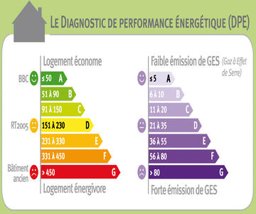Diagnostic de Performance Energétique - DPEQu'est-ce-qu'un DPE ?C'est une évaluation qui renseigne sur la quantité d'énergie consommée par un bâtiment et évalue sa performance énergétique, ainsi que l'impact de sa consommation en terme d'émissions de gaz à effet de serre. Le contenu détaillé du DPELe DPE décrit le bâtiment ou le logement et ses équipements de chauffage, de production d'eau chaude sanitaire, de refroidissement, de ventilation ainsi que les conditions de leur utilisation. Il indique suivant les cas, soit la quantité d'énergie effectivement consommée soit la consommation d'énergie estimée pour une utilisation standardisée du bâtiment ou du logement. Les étiquettes énergie du DPE![]() Deux étiquettes classent le logement ou le bâtiment en fonction de sa performance énergétique et de la quantité de gaz à effet de serre émise. L'utilisation d'une étiquette énergie analogue à celle en usage pour les équipements électroménagers est un facteur d'appropriation favorable. Les seuils des classes sont indiqués sur le schéma ci-contre. L'information est complétée par une indication sur les émissions de CO2 liées aux usages pris en compte dans l'étiquette climat ci-dessous. En France, une étude sur le diagnostic de performance énergétique (DPE) a démontré que plus de deux logements sur trois sont classés F et G. Un logement A ou B économise 5 fois plus d'énergie qu'un logement mal classé. LE DPE est-il obligatoire ?Le diagnostic est obligatoire à l'occasion de la vente ou de la construction de tout bâtiment ou partie de bâtiment clos est ouvert, quel que soit son usage et doit être établi à l'occasion de la mise en location d'un logement ou d'un bâtiment à usage principal d'habitation. C'est également une démarche indispensable pour économiser de l'énergie, le diagnostic énergétique ou bilan de performance thermique est la première étape pour améliorer votre classement énergétique. Durée de validité du DPE